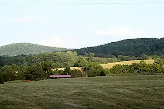 The Southwest Mountains of Virginia are a mountain range centered on Charlottesville, parallel to and geologically associated with the Blue Ridge Mountains, which lie about 30 miles (50 km) to the west.[3] The range is breached by the Rivanna River between Monticello and Pantops Mountain. Some of the more prominent peaks include Carters Mountain,[4] Fan Mountain, Brush Mountain, Peters Mountain,[1] Walton's Mountain, and Hightop Mountain.