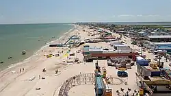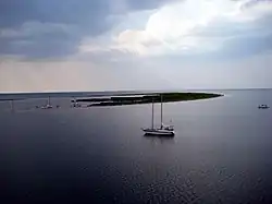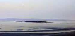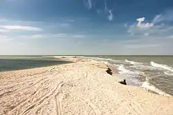 Most spits have a triangular base and numerous lagoons on their west side. The ends of some spits are widened and bent westwards. Their shape rapidly varies with time. For example, the Arabat Spit (the largest and most stable spit on the Azov Sea) was formed only around 1100–1200 AD,[4] and some spits were partly or entirely washed away by water currents.[5] Many spits are used as resting ground by migrating birds (mostly ducks, geese, swans, sandpipers, great cormorants and seagulls, see e.g. this and this pictures) and therefore some are declared national nature reserves. Examples are the Beglitsk,[6] Bilosaraysk,[7] Kriv[7] and Berdiansk spits. In addition to bird colonies, the Bilosaraysk and Berdiansk spits also host more than 200 vegetation species each.[8][9][10] The Berdiansk Spit is remarkable for having one of the oldest lighthouses on the Azov Sea (160 years old).[11] The Petrushino Spit is historical in that in 1697, Peter I built a major fortress at its base.[12] In July 1711, a Turkish landing operation was defeated there.[13]