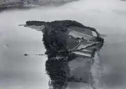 The former priory building is a listed as Swiss heritage site of national significance.[2] It was founded in 1107 when Count Wilhelm III of Burgundy-Mâcon gave his lands in Bellmund and on the island, at the time known as the "Island of the Counts", to Cluny Abbey. A small monastery was built on the island, possibly on the site of an earlier church. Traces of Merovingian graves, a Carolingian wooden monastery and an abandoned 11th century basilica[3] have been discovered near the current building. The small priory had at most five monks in residence and may have had additional rooms for travelers. On 10 February 1127 Wilhelm IV, the son of Wilhelm III, was buried in the monastery graveyard after he was murdered in Payerne a few days previously.[4] A monastery church was built north of the priory in the first third of the 12th century.[5] The vogt and patronage rights over the monastery remained with the Counts of Burgundy before probably passing to the Zähringens. They were followed by the Counts of Kyburg, in the 13th century and the Counts of Nidau in the first half of the 14th.[4] In 1484 the priory was dissolved and the estates passed to the college of canons of St. Vinzenz Cathedral in Bern. After Bern accepted the Protestant Reformation in 1530, the priory buildings were transferred to the Niederen Spital (a hospital) in Bern. The monastery church was demolished in 1577 and a wine cellar built below the former choir. Over the following years the priory building was used as a sheep farm and an inn and it was extensively modified, renovated and rebuilt. Originally built as a four-sided building with a central courtyard, in 1810/15 the north wing was demolished turning it into a three-wing, horseshoe-shaped building.[3] The south wing was unified under a single roof in the 19th century and in 1911 it was renovated in the Swiss Heimatstil.[5]