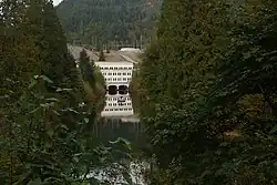 The Stave River, the traditional territory of the Sxa'yaks (Skayuks), a vanished Halqemeylem-speaking Coast Salish people related to today's Sto:lo, was a productive salmon river. The Skayuks demise was caused by the introduction of smallpox by the Europeans and subsequent expansion by the Kwantlen First Nation.[2] The presence of large red cedar trees attracted lumber companies, notably Stave Lake Cedar, whose mill was a mile above the damsite. The lower portion of the Stave is called Hayward Lake, formed by Ruskin Dam and formerly a canyon similar to Capilano and Lynn Canyons, and at its head in the grounds of the one-time community of worker's housing, there is a recreation area there and the beginning of a lakeside trail using the right-of-way of a railway line.