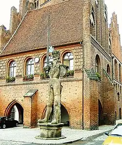 There are various well-preserved historical buildings in Stendal, e.g., the Tangemünde Gate, a medieval city gate dating from 1220 and Uenglinger Gate built in the 15th century.[8] The Powder Tower (Pulverturm) which was built around 1450 is a former defence tower of the medieval city wall. St. Nicholas Church was built in 1423-1467 and heavily damaged by bombs in 1945. Reconstruction was started in 1946, interrupted several times and completed in 2013.[9] The City Hall in the Market Place where a statue of Roland can be seen was built in the 14th century. St. Mary's Church with its two towers measuring 84 metres in height was inaugurated in 1447, and its altar dates from 1471.[10] St. Jakobi Church in the northern part of the historical centre was built 1311-1477. St. Petri Church built at the end of the 13th century is the oldest church in Stendal. Breite Straße with many well-preserved medieval houses is the main street of the old city centre.