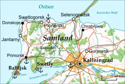 The Strait of Baltiysk (Russian: Балтийский пролив, Polish: Cieśnina Piławska, German: Pillauer Tief) is a strait enabling passage from the Baltic Sea into the brackish Vistula Lagoon, located in Kaliningrad Oblast, Russia. The constructed strait separates the Vistula Spit from the peninsula (called Pillau Peninsula in Russia: Пиллауский полуостров, after the Pillau Fortress) which was part of the Vistula Spit in the 15th century and now is part of Sambian Peninsula.