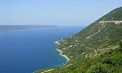 The Strait of Ithaca (Greek: Στενό Ιθάκης, Steno Ithakis) is a strait separating the islands of Kefalonia to the west and Ithaca to the east. The Strait is approximately 20 km long and 4 to 6 km wide. It runs from south to north, starting at Cape Dichalia and Cape Agios Andreas (northeast of Sami and the Agia Effimia Bay) and ending at Cape Viotis and Cape Exogi (north of Fiskardo). The boating route linking the ports of Sami and Fiskardo lies in this strait. The Strait connects to the Ionian Sea on both sides. The Agia Effimia and Sami bays lie to the southwest.