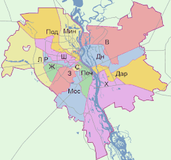Administratively, the city is divided into districts (raions), which have their own units of central and locally elected councils with jurisdiction over a limited scope of affairs.[1] Between 2010 and 2022[nb 1] the Kyiv district councils were abolished.[2]