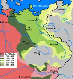 In the Middle Ages the regions situated on the mountainous border of the Duchy and the Kingdom of Bohemia (Crown of Saint Václav) had since the Migration Period been settled mainly by western Slavic Czechs. Along the Bohemian Forest in the west, the Czech lands bordered on the German Slavic tribes (German Sorbs) stem duchies of Bavaria and Franconia; marches of the medieval German kingdom had also been established in the adjacent Austrian lands south of the Bohemian-Moravian Highlands and the northern Meissen region beyond the Ore Mountains. In the course of the Ostsiedlung (settlement of the east), German settlement from the 13th century onwards continued to move into the Upper Lusatia region and the duchies of Silesia north of the Sudetes mountain range.