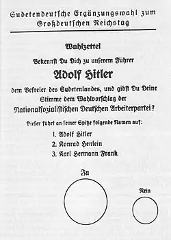 Although "Henlein and the SdP had become accessories in Hitler's escalating campaign to annex the Sudetenland to the German Reich" by the summer of 1938, the supporters of the SdP supported autonomy within Czechoslovakia rather than annexation into Germany.[14] Contemporary reports of The Times found that there was a "large number of Sudetenlanders who actively opposed annexation", and that the pro-German policy was challenged by the moderates within the SdP as well; according to Wickham Steed, over 50% of Henlein's supporters favoured greater autonomy within Czechoslovakia rather than joining Germany.[15] Sudeten German historian Emil Franzel argues that the mainstream wing of Henlein's party was "not striving for annexation to Germany, but for genuine autonomy", and the majority of negotiators who conducted talks with Hodža and Beneš belonged to the pro-autonomy wing and were unaware of Henlein's agreements with Hitler.[16]