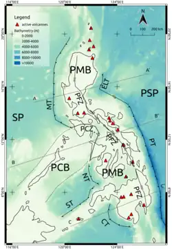 The Sulu Trench is an oceanic trench in the Pacific Ocean, located west of the islands of Mindanao and Sulu in the Philippines. The trench reaches a depth of about 5,600 metres (18,400 ft), in contrast with the average depth of the South China Sea of about 1,500 metres (4,900 ft). The trench formed when the Sunda Plate (part of the Eurasian Plate) subducted below the Philippine Mobile Belt. The convergent boundary terminates at the Negros Trench in the east.[1][2]