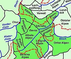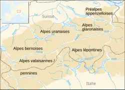 - ^ (German: Schweizer Alpen, French: Alpes suisses, Italian: Alpi svizzere, Romansh: Alps svizras)