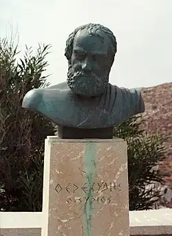 Throughout history, the island was known as Syra (Ancient Greek: Σύρα),[2] then Syros or Siros (Σῦρος). In later times, it appears to have been inhabited by the Phoenicians. In the Odyssey, Syros was the country of the swineherd Eumaeus who described it at length (Odyssey, XV, 403 sq.), although it has also been suggested that Eumaeus referred to Syracuse, Sicily.[3]