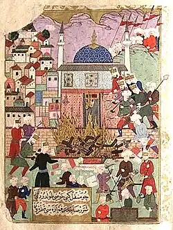 In 1501, Ismail I entered Tabriz and proclaimed it the capital of his Safavid state. In 1514, after the Battle of Chaldiran, Tabriz was sacked by Selim I.[43] On 16 July 1534, prior to Ottoman conquest of Baghdad, Pargalı Ibrahim Pasha occupied Tabriz.[44] In 1555, Tahmasp I transferred its capital to Qazvin to avoid the growing threat of the Ottoman army to his capital.