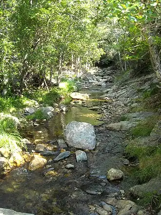 In the headwaters of the Gévalo River are remnants of Prunus lusitanica Portuguese laurel cherry shrubs, relict forests of the Cenozoic tropical flora, which can also be found in Extremadura in the upper, narrower and more sheltered stretches of the Ibor, Gualija and Viejas Rivers.