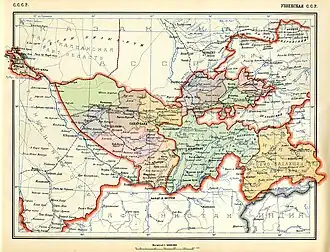 The Soviets aimed to create ethnically homogeneous republics, however many areas were ethnically-mixed (e.g. the Ferghana Valley) and it often proved difficult to assign a ‘correct’ ethnic label to some peoples (e.g. the mixed Tajik-Uzbek Sart, or the various Turkmen/Uzbek tribes along the Amu Darya).[7][8] Local national elites strongly argued (and in many cases overstated) their case and the Soviets were often forced to adjudicate between them, further hindered by a lack of expert knowledge and the paucity of accurate or up-to-date ethnographic data on the region.[7][9] Furthermore, NTD also aimed to create ‘viable’ entities, with economic, geographical, agricultural and infrastructural matters also to be taken into account and frequently trumping those of ethnicity.[10][11] The attempt to balance these contradictory aims within an overall nationalist framework proved exceedingly difficult and often impossible, resulting in the drawing of often tortuously convoluted borders, multiple enclaves and the unavoidable creation of large minorities who ended up living in the ‘wrong’ republic. Additionally the Soviets never intended for these borders to become international frontiers as they are today.