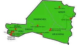 The Tampin District is a district in Negeri Sembilan, Malaysia. The district covers 878.69 square kilometres (339.26 sq mi) and is further divided into four adat socio-political provinces (luaks): Tampin Adat Territory (which includes the town of Tampin), Ayer Kuning, Gemencheh and Pasir Besar.[3]