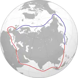 Russia considers portions of the Northern Sea Route, which encompasses only navigational routes through waters within Russia's Arctic EEZ east from Novaya Zemlya to the Bering Strait, to pass through Russian territorial and internal waters in the Kara, Vilkitskiy, and Sannikov Straits.The year-round navigability of the Northern Sea Route could reduce shipping costs from Europe to Asia by 50%.[2] The Northeast passage currently (2025) is navigable by commercial shipping for approximately 2–4 months a year but by 2030 this route is expected to be navigable for 4–6.5 months a year.[74]