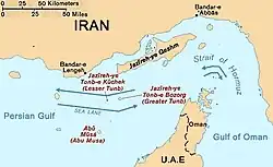 In 1971, after the British left the area Iranian forces claimed the islands of Abu Musa, Greater Tunb, and Lesser Tunb, located at the mouth of the Persian Gulf between Iran and the UAE. The Iranians asserted their claims to the islands. Iran continued to hold the islands in 1993, and its action remained a source of contention with the UAE, which claimed authority by virtue of Britain's transfer of the islands to the emirates of Sharjah and Ras al-Khaimah. However, Britain had also agreed to give full authority to the Iranians in return for Iran's withdrawal of its claim on Bahrain. By late 1992, Sharjah and Iran had reached agreement with regard to Abu Musa, but Ras al-Khaimah had not reached a settlement with Iran concerning Greater Tunb and Lesser Tunb.[1] The UAE have attempted to bring the dispute before the International Court of Justice,[2] but Iran refused. Tehran says the islands always belonged to it as it had never renounced possession of the islands, and that they are part of Iranian territory.[3]