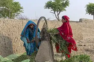 The Thal desert is deficit in resources and infrastructure with very limited health services, schools, electricity, water and sanitation.[12] Erratic rainfall patterns, frequent droughts and shifting sand dunes result in serious losses to farmers and have contributed to the widespread poverty in the area.[22] The population lives in scattered settlements and most farmers own less than 5 acres of land, which is difficult to cultivate.[12] Agriculture and livestock form the primary sources of livelihood with gram flour being the main cash crop. Milk production is also a major source of income and for this reason, cows and buffaloes are raised more frequently than camels or goats.[2] Livestock productivity is limited due to fodder shortages as a result of climatic fluctuations, limited availability of veterinary services and poor access to animal vaccinations.[8] In cases of crop failure, livestock is often sold in order to improve financial standing.[15] Skins from livestock such as sheep and camels are also sold for making leather goods whilst teeth and bones are utilised for objects such as buttons, jewellery, and decoration.[18] Camels are also commonly used for transportation throughout the region.[10]