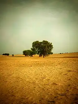 The region is characterized by sand dunes, prone to massive shifting and rolling, as well as scant rainfall, high diurnal variation of temperature and high wind velocity.[6] Aridity is a common feature and perennial grasses make up much of the vegetation.[7] Agriculture and livestock rearing form the main sources of livelihood for the population, who live in small scattered settlements throughout the desert.[8]