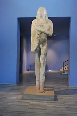 Lying close to the coast of Eastern Macedonia, Thasos was inhabited from the Palaeolithic period onwards,[4] but the earliest settlement to have been explored in detail is that at Limenaria, where remains from the Middle and Late Neolithic relate closely to those found at the mainland's Drama plain. In contrast, Early Bronze Age remains on the island align it with the Aegean culture of the Cyclades and Sporades, to the south; at Skala Sotiros[5] for example, a small settlement was encircled by a strongly built defensive wall. Even earlier activity is demonstrated by the presence of large pieces of 'megalithic' anthropomorphic stelai built into these walls, which, so far, have no parallels in the Aegean area.