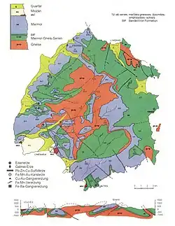 The earliest mining on the island has been dated to around 13,000 BC, when Paleolithic miners dug a shaft at the site of the modern-era Tzines iron mine for the extraction of limonitic ochre.[26] Mining for base and precious metals started around the 7th century BC with the Phoenicians, followed in the 4th century by the Greeks, then the Romans. These later mines were both open-cast and underground, mostly to exploit the island's numerous karst hosted calamine deposits for their lead and silver. Gold, copper and iron were also found; the Byzantines quarried marble on the island.