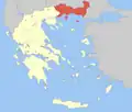 Thasos is a separate regional unit of the East Macedonia and Thrace region, and the only municipality of the regional unit. As a part of the 2011 Kallikratis government reform, the regional unit Thasos was created out of part of the former Kavala Prefecture.[23] The municipality, unchanged at the Kallikratis reform, includes a few uninhabited islets besides the main island Thasos and has an area of 380.097 km2.[24] The province of Thasos (Greek: Επαρχία Θάσου) was one of the provinces of the Kavala Prefecture. It had the same territory as the present municipality.[25] It was abolished in 2006.