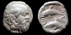 Around 650 BC, or a little earlier, Greeks from Paros founded a colony on Thasos.[11] A generation or so later, the poet Archilochus, a descendant of these colonists, wrote of casting away his shield during a minor war against an indigenous Thracian tribe, the Saians.[12] Thasian power, and sources of its wealth, extended to the mainland, where the Thasians owned gold mines even more valuable than those of the island; their combined annual revenues amounted to between 200 and 300 talents. Herodotus says that the best mines on the island were those opened by the Phoenicians on the east side of the island, facing Samothrace. Archilochus described Thasos as "an ass's backbone crowned with wild wood." The island's capital, Thasos, had two harbours. Besides its gold mines, the wine, nuts and marble of Thasos were well known in antiquity.[10] Thasian wine was quite famous. Thasian coinage bore images of the wine-god Dionysos and grape bunches.[13]