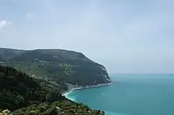 The coastline is 173 kilometres (107 mi) long and is relatively flat and straight except for the hilly area between Gabicce and Pesaro in the north, and the eastern slopes of Monte Conero near Ancona.