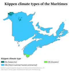 In spite of its name, the Maritimes has a humid continental climate of the warm-summer subtype. Especially in coastal Nova Scotia, differences between summers and winters are narrow compared to the rest of Canada. The inland climate of New Brunswick is in stark contrast during winter, resembling more continental areas. Summers are somewhat tempered by the marine influence throughout the provinces, but due to the southerly parallels still remain similar to more continental areas further west. Yarmouth in Nova Scotia has significant marine influence to have a borderline oceanic microclimate, but winter nights are still cold even in all coastal areas. The northernmost areas of New Brunswick are only just above subarctic with very cold continental winters.