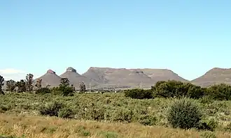 The hills (or "koppies" as they are known locally) are topped with dolorite, and are nearly identical in appearance. They can be seen just to the east of the N1 highway, roughly 75 kilometres (47 mi) outside Beaufort West, north of the junction of the N1 and the N12 roads. Due to the open and mountainous Karoo scenery, the area has become a relatively well-known landmark.[1]