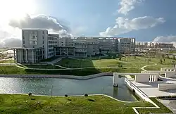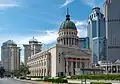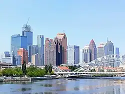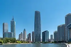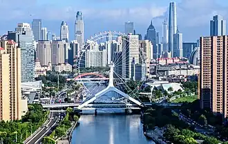 Tianjin is currently a dual-core city, with its main urban area (including the older part of the city) located along the Hai River, which connects to the Yellow and Yangtze Rivers via the Grand Canal; and Binhai, an adjacent New Area urban core located east of the older part of the city on the coast of the Bohai. Since 2010, Tianjin's Yujiapu Financial District has become known as China's Manhattan[12][13] and the city is considered to be one of the world's top 100 cities,[14] including in the Global Financial Centres Index. As of 2024, Tianjin was ranked as a Beta+ (global second tier) city together with Barcelona and Rome by the Globalization and World Cities Research Network.[15] In 2025, Tianjin held the Shanghai Cooperation Organization summit.[16]