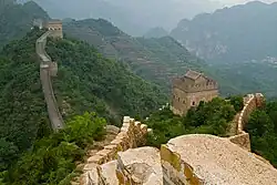 The city has 153 km (95 mi) of coastline and 1,137.48 kilometers (706.80 mi) of land border.[28] It is located at the northern end of the Grand Canal of China, which connects with the Yellow and Yangtze Rivers. The municipality is generally flat and is swampy near the coast; however, it has hills in the north, where the Yan Mountains enter Tianjin. Tidal flats occur on the coastal plain adjacent to the city.[29] The highest point in the municipality is Jiuding Peak (九顶山) in Ji County on the northern border with Hebei; the mountain has an altitude of 1,078.5 m (3,538 ft).