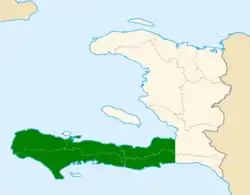 The Tiburon Peninsula (French: Péninsule de Tiburon), or simply "the Tiburon" (le Tiburon), is a region of Haiti encompassing most of Haiti's southern coast.[1] It starts roughly at the southernmost point of the Haiti-Dominican Republic border and extends westward near Cuba, forming a large headland. Three of Haiti's ten departments are located entirely within the region. They are the departments of Grand'Anse, Nippes and Sud. A large part of Ouest department is also located in the region, with the capital, Port-au-Prince serving as the line of demarcation between central Haiti and the south. Half of Sud-Est is also located within the Tiburon Peninsula. The mountains on the peninsula are known as the Massif de la Hotte.
