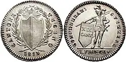 The lands of the canton of Ticino are the last lands to be conquered by the Swiss Confederation. The Confederation gave up any further conquests after their defeat at the battle of Marignano in 1515 by Francis I of France. The Valle Leventina revolted unsuccessfully against Uri in 1755.[10] In February 1798 an attempt of annexation by the Cisalpine Republic was repelled by a volunteer militia in Lugano. Between 1798 and 1803, during the Helvetic Republic, two cantons were created (Bellinzona and Lugano) but in 1803 the two were unified to form the canton of Ticino that joined the Swiss Confederation as a full member in the same year under the Act of Mediation.[11] During the Napoleonic Wars, many Ticinesi (as was the case for other Swiss) served in Swiss military units allied with the French. The canton minted its own currency, the Ticinese franco, between 1813 and 1850, when it began the use of the Swiss franc.