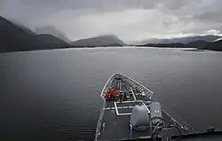 | 7 October | Diego de Almagro Island, Chile | On 7 October, Golden Hinde anchors for only one hour while Wynter remains close to shore in a deep and dangerous bay. This uncertain location of this 40 fathom deep bay is recorded at 51° by da Silva. Raymond Aker suggests the location to be at the east side of Isla Diego de Almargo. A gale strikes and Golden Hinde loses her anchor which forces the two ship fleet to struggle out to sea as they are forced southward and separated.