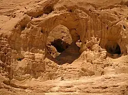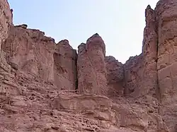 The most well-known formation in Timna Valley are Solomon's Pillars. The pillars are natural structures that were formed by centuries of water erosion through fractures in the sandstone cliff until it became a series of distinct, pillar-shaped structures.[2]