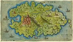 Anciently, the island was called Tenos (Ancient Greek: Τῆνος), and was also called Hydroussa/Hydroessa (Ὑδροῦσσα, Ὑδρόεσσα) from the number of its springs, and Ophioussa (Ὀφιοῦσσα) because it abounded in snakes.[6][7][8] The sons of Boreas are said to have been slain in this island by Heracles.[9] In the invasion of Greece by Xerxes I, the Tenians were compelled to serve in the Persian fleet; but a Tenian trireme deserted to the Greeks immediately before the Battle of Salamis (480 BCE), and accordingly the name of the Tenians was inscribed upon the tripod at Delphi in the list of Grecian states which had overthrown the Persians.[10] Pausanias relates that the name of the Tenians was also inscribed on the statue of Zeus at Olympia among the Greeks who had fought at the Battle of Plataea.[11] The Tenians afterwards formed part of the Delian League, and are mentioned among the subject allies of Athens at the time of the Sicilian expedition.[12] They paid a yearly tribute of 3600 drachmae, from which it may be inferred that they enjoyed a considerable share of prosperity.[13] Alexander of Pherae took possession of Tenos for a time;[14] and the island was afterwards granted by Marcus Antonius to the Rhodians.[15]