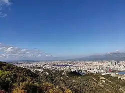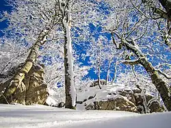 The city is surrounded by two important protected areas: the Dajti National Park and Mali me Gropa-Bizë-Martanesh Protected Landscape. In winter, the mountains are often covered with snow and are a popular retreat for the population of Tirana, which rarely receives snowfalls. In terms of biodiversity, the forests are mainly composed of pine, oak and beech, while its interior relief is dotted with canyons, waterfalls, caves, lakes and other landforms.[55] Thanks to its natural heritage, it is considered the "Natural Balcony of Tirana". The mountain can be reached by a narrow asphalt mountain road onto an area known as Fusha e Dajtit. From this small area there is a view of Tirana and its plain.