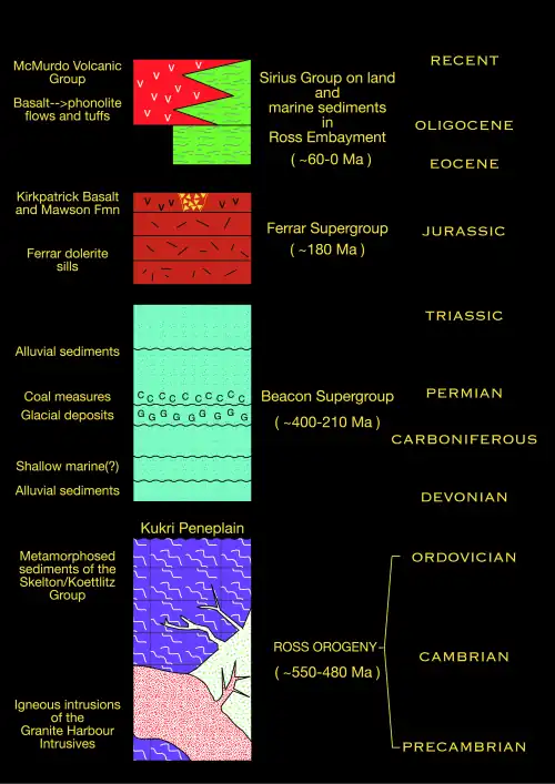 The mountains consist of sedimentary layers lying upon a basement of granites and gneisses. The sedimentary layers include the Beacon Supergroup sandstones, siltstones, and coal deposited beginning in the Silurian period and continuing into the Jurassic. In many places, the Beacon Supergroup has been intruded by dikes and sills of Jurassic age Ferrar Dolerite. Many of the fossils found in Antarctica are from locations within these sedimentary formations.