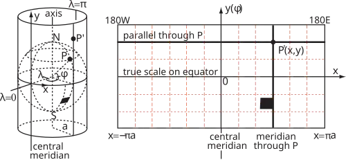 X and Y values are obtained from latitude (φ) and longitude (λ). The normal cylindrical projections are described in relation to a cylinder tangential at the equator with axis Y along the polar axis of the sphere. The equator line corresponds to the X-axis line, so the value of the x-coordinate is proportional to λ.