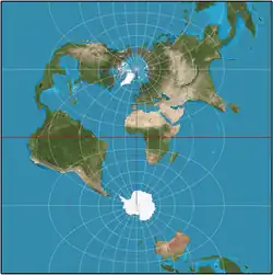 - The meridians at 90° east and west of the chosen central meridian project to horizontal lines through the poles. The more distant hemisphere is projected above the north pole and below the south pole.