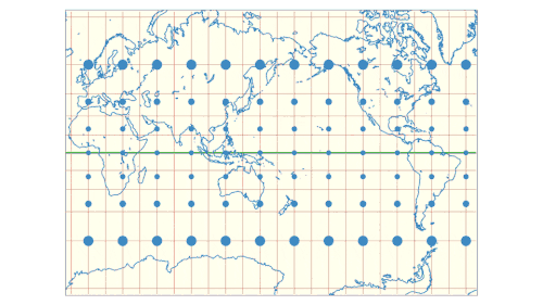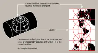 | • | The projection is reasonably accurate near the equator. Scale at an angular distance of 5° (in latitude) away from the equator is less than 0.4% greater than scale at the equator, and is about 1.54% greater at an angular distance of 10°. | • | The projection is reasonably accurate near the central meridian. Scale at an angular distance of 5° (in longitude) away from the central meridian is less than 0.4% greater than scale at the central meridian, and is about 1.54% at an angular distance of 10°. | |