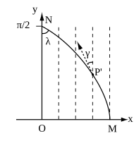 The angles of the two graticules are related by using spherical trigonometry on the spherical triangle NM′P defined by the true meridian through the origin, OM′N, the true meridian through an arbitrary point, MPN, and the great circle WM′PE. The results are:[27]