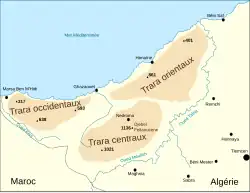 The tribes living in this area had been grouped since the Middle Ages[5] into a confederation called Trara,[6] named after the same massif. This confederation was composed of seven tribes of the Koumia branch of the Beni Faten:[7] Beni Mishel,[8] Beni Menir, Beni Ouarsous, Beni Khallad,[9] Beni Abed, Beni Frouzech, and Beni Rimâne. They are also called Oulahca[10][11]