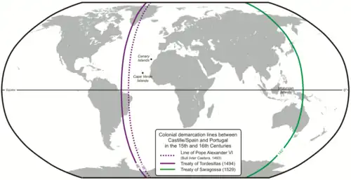 | Purpose | To resolve the conflict that arose from the 1481 papal bull Aeterni regis which affirmed Portuguese claims to all non-Christian lands south of the Canary Islands after Columbus claimed the Antilles for Castile, and to divide trading and colonising rights for all lands located west of the Canary Islands between Portugal and Castile (later applied between the Spanish Crown and Portugal) to the exclusion of any other Christian empires. |