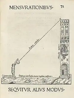 The use of triangles to estimate distances dates to antiquity. In the 6th century BC, about 250 years prior to the establishment of the Ptolemaic dynasty, the Greek philosopher Thales is recorded as using similar triangles to estimate the height of the pyramids of ancient Egypt. He measured the length of the pyramids' shadows and that of his own at the same moment, and compared the ratios to his height (intercept theorem).[2] Thales also estimated the distances to ships at sea as seen from a clifftop by measuring the horizontal distance traversed by the line-of-sight for a known fall, and scaling up to the height of the whole cliff.[3] Such techniques would have been familiar to the ancient Egyptians. Problem 57 of the Rhind papyrus, a thousand years earlier, defines the seqt or seked as the ratio of the run to the rise of a slope, i.e. the reciprocal of gradients as measured today. The slopes and angles were measured using a sighting rod that the Greeks called a dioptra, the forerunner of the Arabic alidade. A detailed contemporary collection of constructions for the determination of lengths from a distance using this instrument is known, the Dioptra of Hero of Alexandria (c. 10–70 AD), which survived in Arabic translation; but the knowledge became lost in Europe. Gemma Frisius was the first to propose the systematic use of triangulation in surveying and cartography in 1533, although he does not appear to have applied his idea. In 1615 Snellius, after the work of Eratosthenes, reworked the technique for an attempt to measure the circumference of the earth.