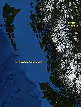 The Tuzo Wilson Seamounts, also called J. Tuzo Wilson Knolls and Tuzo Wilson Knolls, are two young active[1] submarine volcanoes off the coast of British Columbia, Canada, located 200 km (124 mi) northwest of Vancouver Island and south of the Haida Gwaii archipelago (briefly known as the Queen Charlotte Islands.) The two seamounts are members of the Kodiak-Bowie Seamount chain, rising 500 m (1,640 ft) to 700 m (2,297 ft)[2] above the mean level of the northeastern Pacific Ocean and is a seismically active site southwest of the southern end of the Queen Charlotte Fault. They are named after Canadian geologist John Tuzo Wilson.[3]