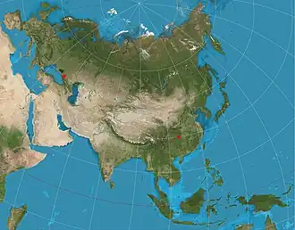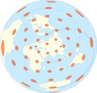 The projection has been used for all maps of the Asian continent by the National Geographic Society atlases since 1959,[4] though its purpose in that case was to reduce distortion throughout Asia rather than to measure from the two loci.[5] The projection sometimes appears in maps of air routes. The Chamberlin trimetric projection is a logical extension of the two-point idea to three points, but the three-point case only yields a sort of minimum error for distances from the three loci, rather than yielding correct distances. Tobler extended this idea to arbitrarily large number of loci by using automated root-mean-square minimization techniques rather than using closed-form formulae.[6]