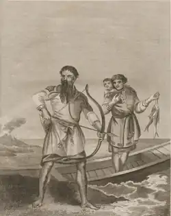 The shoreline of Uchiura Bay was first settled by the Jōmon people as early as 4000 BC. Trade settlements have been found along its shoreline, such as the Ōfune Site where the Jōmon people relied on the body of water for trade routes to other Jōmon settlements in northern Tōhoku.[1] In modern history, the bay was charted during the late-eighteenth century voyage of Royal Navy Commander William Robert Broughton and the crew of HMS Providence during the eruption of nearby Mount Usu. Due to the eruptive activity, they labeled the bay as "Volcano Bay" in September 1796. Commander Broughton and his crew mingled extensively with the Ainu and Japanese living around the bay while they surveyed the bay's coastline. At a dinner they exchanged maps with the Japanese and conversed using Russian.[2]
