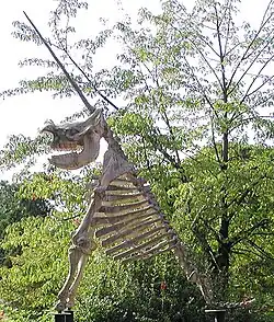 The cave was first mentioned in the records in 1541.[3] In 1686, Gottfried Wilhelm Leibniz visited the cave and wrote a report about it mentioning the local trade with unicorn artefacts. In those days, fossilized bones supposed to be from unicorns were ground and used for making medicine. In the 17th century, Otto von Guericke, the mayor of Magdeburg, wrote a newspaper article about the finding of some ancient animal bones in the Zeunickenberg, a Harz mountain near Quedlinburg. Based on Guericke’s writings, Leibniz drew a fictional reconstruction of the unicorn's skeleton using the bones that had been found in the cave and published the drawing in his book Protogaea.