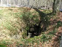 According to local folklore, an old and mystical woman lived in a cave in the nearby village of Scharzfeld.[5][6] As she was a pagan, she was forced to flee from a group of Frankish warriors, led by a monk in a black habit. A unicorn is said to have appeared and protected her from the pursuers, allowing her to escape and join the witches' community on the Brocken Mountain. The unicorn then chased away the warriors and black monk, causing him to disappear into a deep hole while running. This hole then led to the Unicorn Cave.