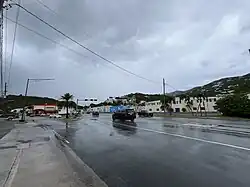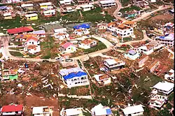 In September 2017, Category 5 Hurricane Irma caused catastrophic damage, particularly to St. John and St. Thomas. Just two weeks later, Category 5 Hurricane Maria ravaged all three islands. Sustained winds at the Sandy Point National Wildlife Refuge on St. Croix reached 99 to 104 mph (159 to 167 km/h) and gusted to 137 mph (220 km/h).[41] Even stronger winds likely occurred somewhere across the island's west end. The British Virgin Islands and the other two U.S. Virgin Islands, St. John and St. Thomas, were far enough northeast to avoid the worst from Maria, but were still massively impacted, with great destruction everywhere.[42] A wind gust to 86 mph (138 km/h) was reported at St. Thomas. Weather stations on St. Croix recorded 5 and 10 inches (130 and 250 mm) of rain from the hurricane, and estimates for St. John and St. Thomas were somewhat less.[43] The hurricane killed two people, both in their homes: one person drowned and another was trapped by a mudslide.[44] A third person had a fatal heart attack during the hurricane.[45] The hurricane caused extensive and severe damage to St. Croix. After both hurricanes, the office of Virgin Islands congresswoman Stacey Plaskett stated that 90% of buildings in the Virgin Islands were damaged or destroyed and 13,000 of those buildings had lost their roofs.[46] The Luis Hospital suffered roof damage and flooding, but remained operational.[47]